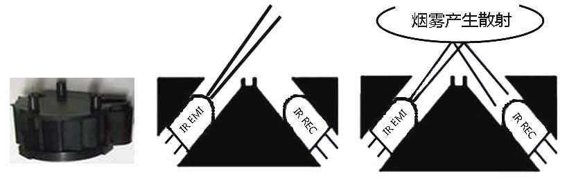 该探测器的检测室内装有发光器件及受光器件。在正常情况下,受光器件接收到发光器件发出的一定光量;而在有烟雾时,发光器件的发射光到受到烟雾的遮挡,使受光器件接收的光量减少,光电流降低,探测器发出报警信号。