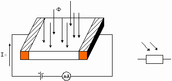 用于制造光敏电阻的材料主要是金属的硫化物、硒化物和碲化物等半导体。通常采用涂敷、喷涂、烧结等方法在绝缘衬底上制作很薄的光敏电阻体及梳状欧姆电极, 然后接出引线,封装在具有透光镜的密封壳体内,以免受潮影响其灵敏度。光敏电阻的原理结构如图所示。在黑暗环境里,它的电阻值很高,当受到光照时,只要光 子能量大于半导体材料的禁带宽度,则价带中的电子吸收一个光子的能量后可跃迁到导带,并在价带中产生一个带正电荷的空穴,这种由光照产生的电子—空穴对增 加了半导体材料中载流子的数目,使其电阻率变小,从而造成光敏电阻阻值下降。光照愈强,阻值愈低。入射光消失后,由光子激发产生的电子—空穴对将逐渐复 合,光敏电阻的阻值也就逐渐恢复原值。