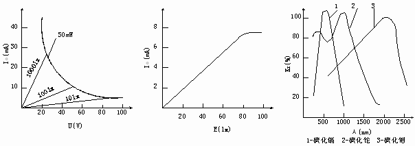 图2.6.2 光敏电阻的伏安特性 图2.6.3 光敏电阻的光电特性 图 2.6.4 光敏电阻的光谱特性